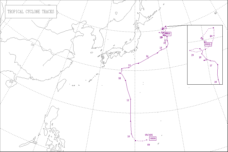 2000年の台風第9号は、8月10日3時に発生し、8月18日21時に消滅しました。最低気圧は975hPaで、最大風速は35m/sでした。