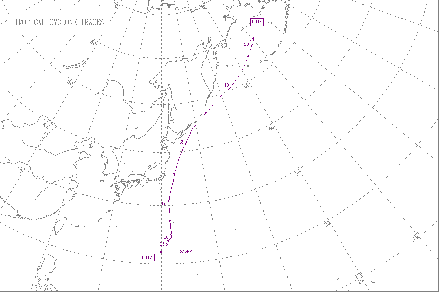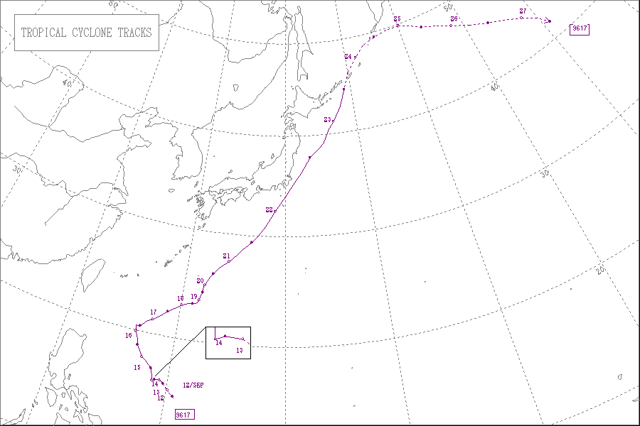 この台風は9月14日には種子島の東海上を北上し、ごく小さく弱い勢力で宮崎県都井岬付近に上陸して九州東岸付近を北上しました。そして、15日に愛媛県宇和島付近に再上陸し、四国を東北東へ進み、兵庫県明石市付近に再上陸し、近畿地方を通って中部地方へ進み、長野県飯田市付近で弱い熱帯低気圧になりました。この熱帯低気圧は関東北部へ進み、東北地方南部の太平洋沖で温帯低気圧に変わりました。