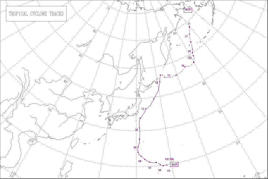 1996年の台風第5号は、7月6日21時に発生し、7月12日15時に消滅しました。最低気圧は970hPaで、最大風速は35m/sでした。