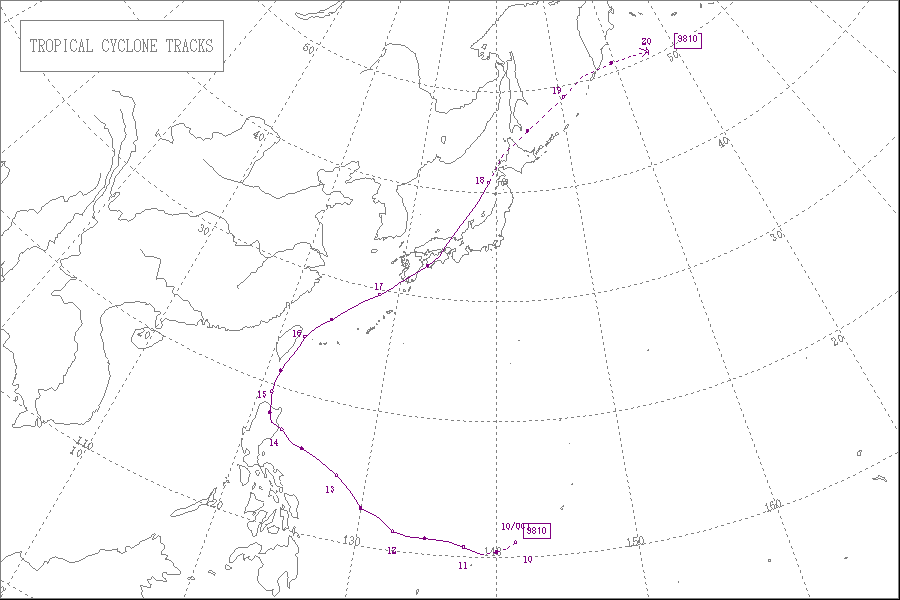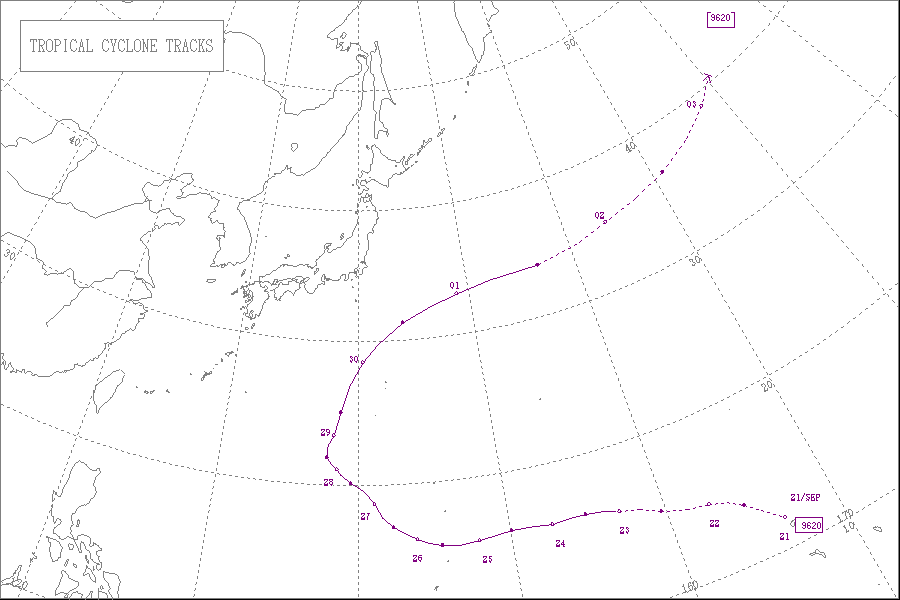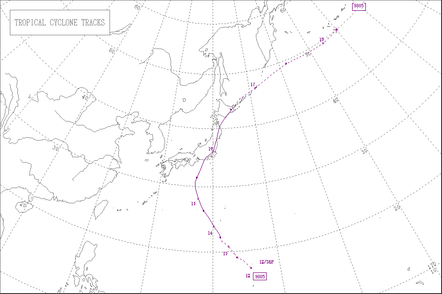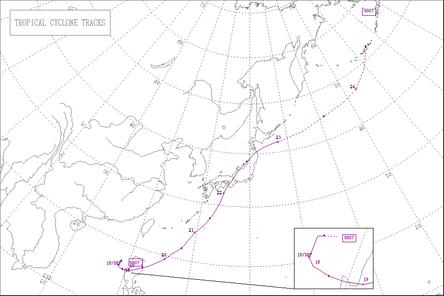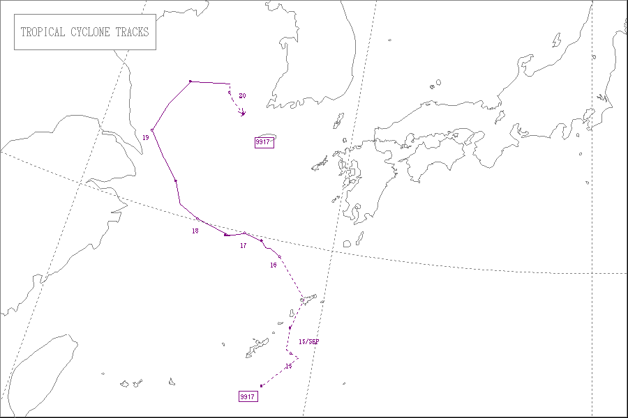 この台風は9月22日9時に沖縄本島の南西の海上にて大型で非常に強い勢力となり、東シナ海を北北東へ進み、24日に天草下島を通過し、中型で強い勢力で熊本県北部に上陸しました。そして、九州北部を通って周防灘へ進み、勢力を維持したまま山口県宇部市付近に再上陸し、中国地方西部を通って日本海へ抜け、25日に中型で並みの強さで北海道の渡島半島付近に再上陸しました。その後、北海道の西岸を北東へ進んで天塩町付近に再上陸し、網走沖で温帯低気圧に変わりました。