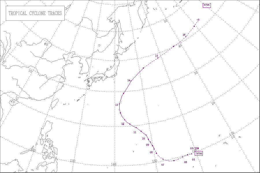 1997年の台風第6号は、6月8日9時に発生し、6月14日21時に消滅しました。最低気圧は930hPaで、最大風速は50m/sでした。