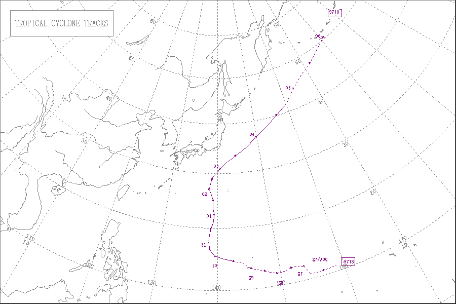 1997年の台風第18号は、8月29日21時に発生し、9月5日3時に消滅しました。最低気圧は940hPaで、最大風速は45m/sでした。