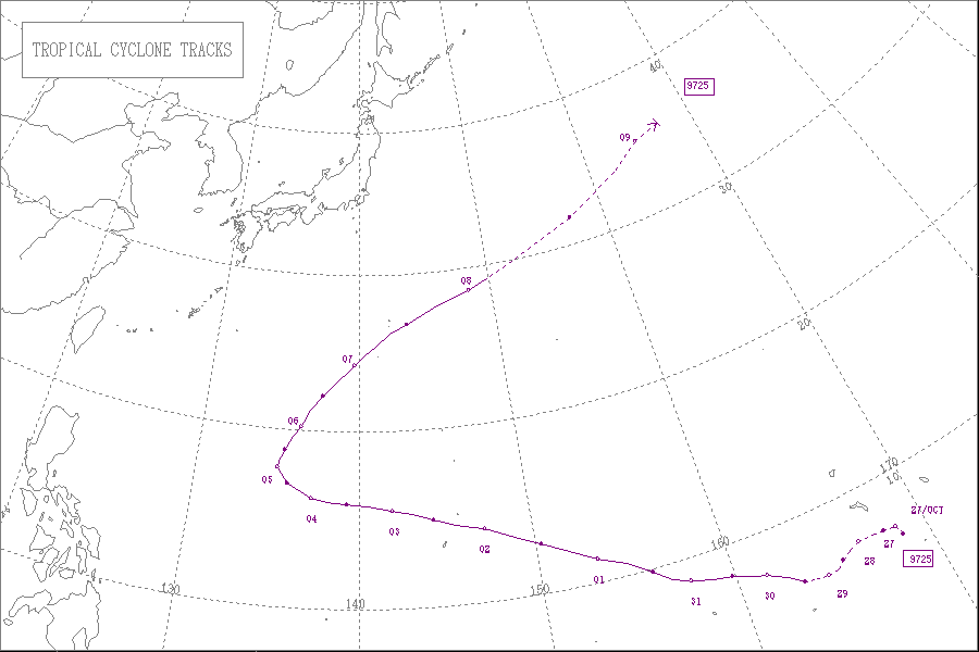 1997年の台風第25号は、10月29日21時に発生し、11月8日12時に消滅しました。最低気圧は910hPaで、最大風速は55m/sでした。