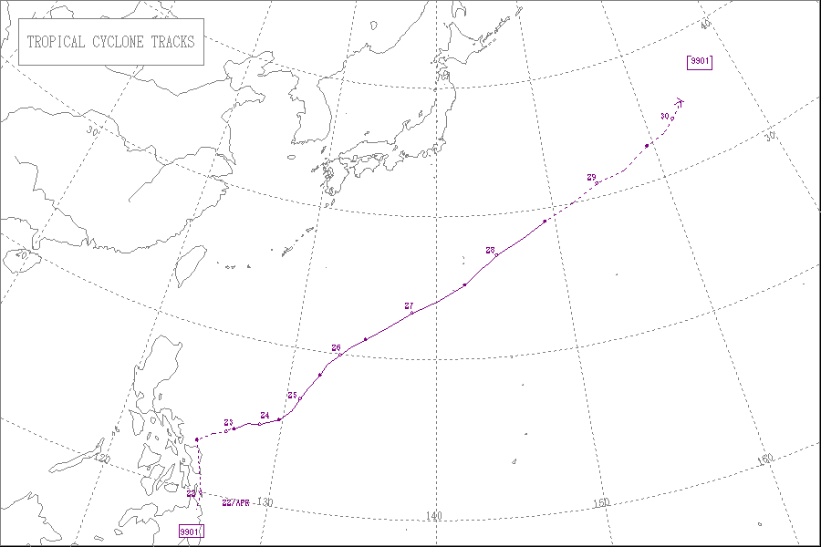 1999年の台風第1号は、4月23日21時に発生し、4月28日21時に消滅しました。最低気圧は980hPaで、最大風速は30m/sでした。