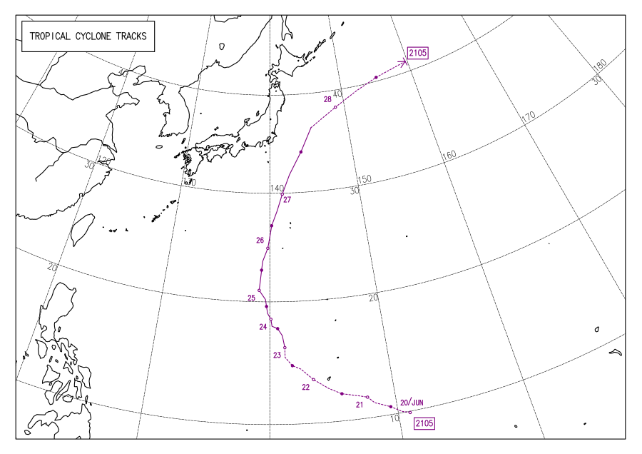 2021年の台風第5号は、6月23日9時に発生し、6月28日3時に消滅しました。最低気圧は980hPaで、最大風速は35m/sでした。