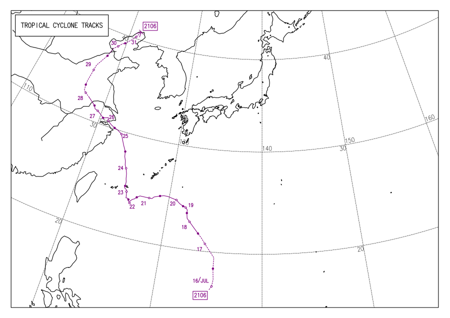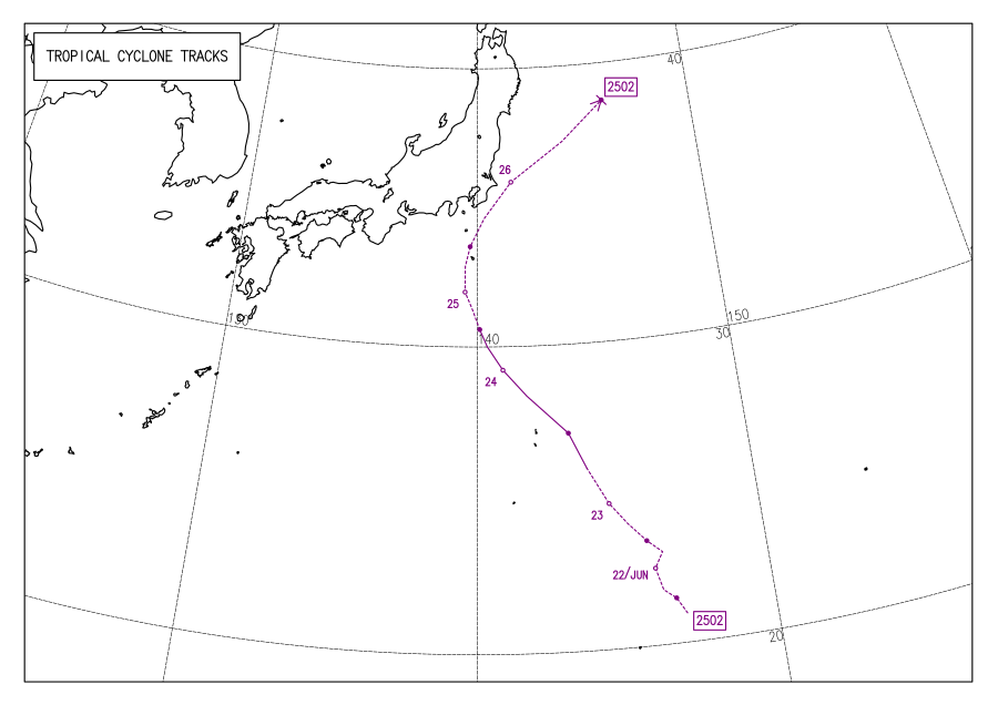 この台風から梅雨前線に向かって湿った空気が流れ込み、山形県・秋田県・北海道北部で記録的な大雨になりました。この台風による日本での被害はありませんでした。