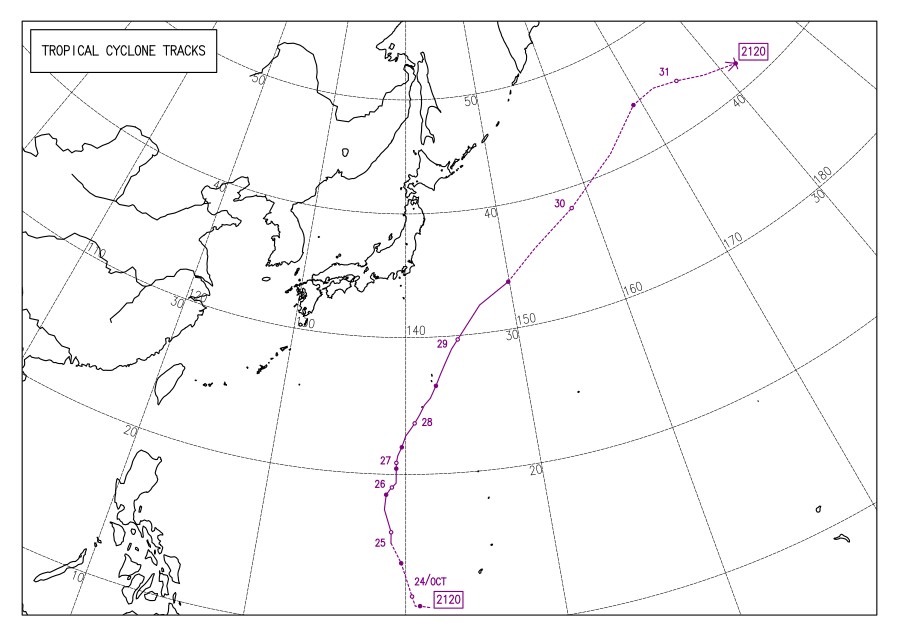 2021年の台風第20号は、10月25日3時に発生し、10月29日21時に消滅しました。最低気圧は965hPaで、最大風速は40m/sでした。