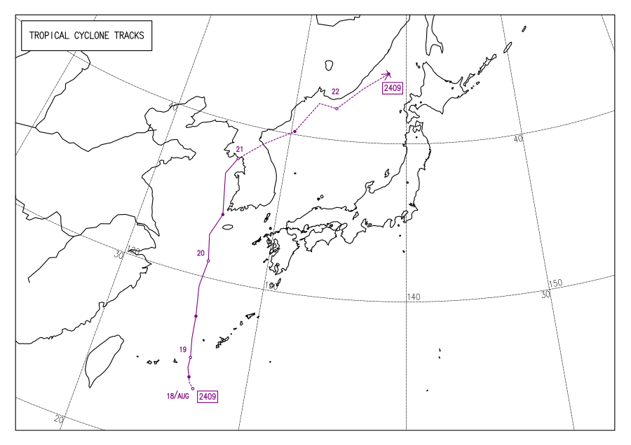 この台風は、鹿児島県に上陸後、宮崎県、大分県を進み、広島県に上陸後に温帯低気圧に変わりました。そして、温帯低気圧は日本海に抜け、秋田県、岩手県を通り、太平洋に抜けました。